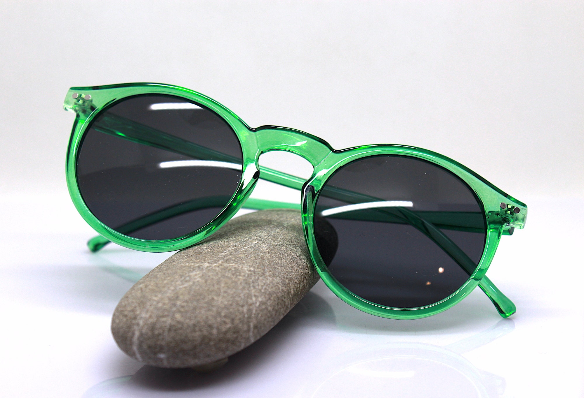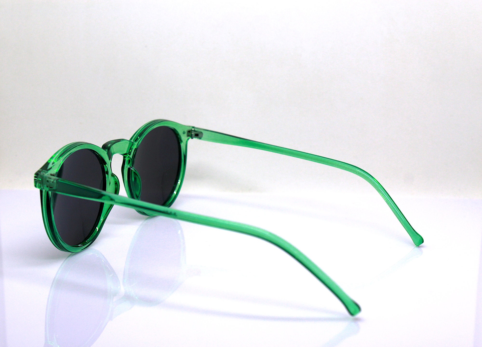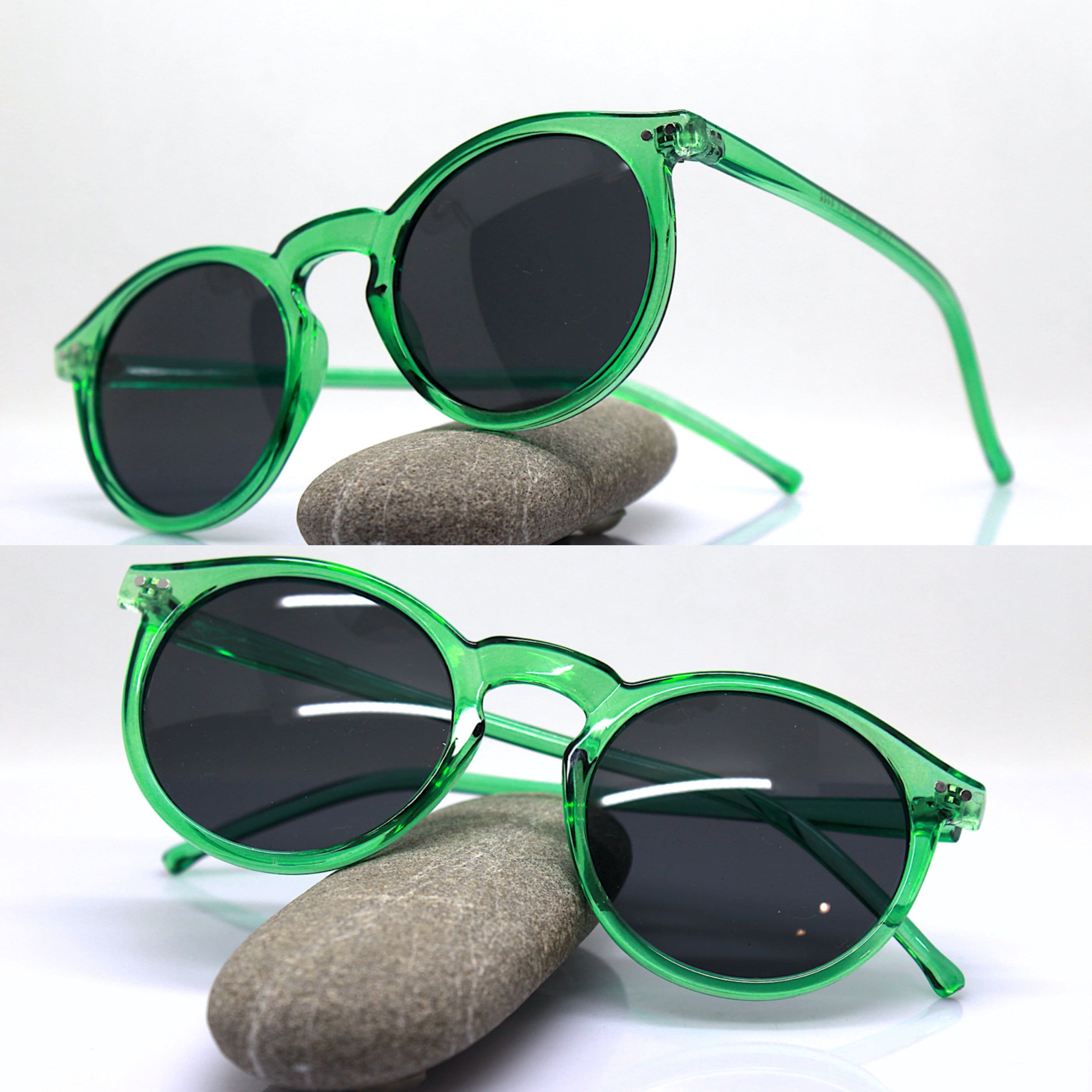 Round oval classic sunglasses man woman transparent crystal green frame black lens retro boho hippy vintage style, Green sunglasses