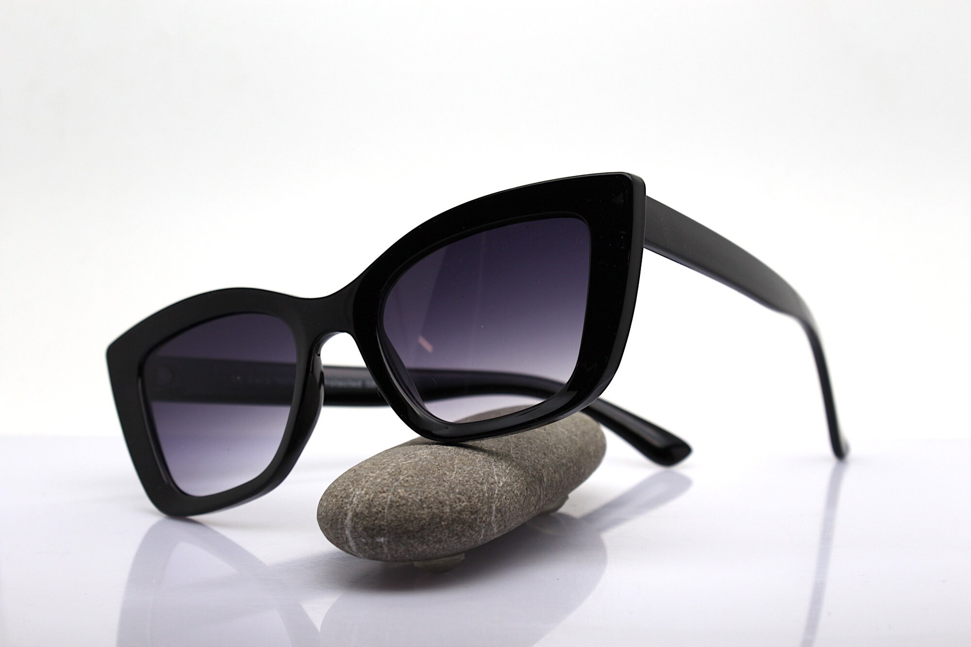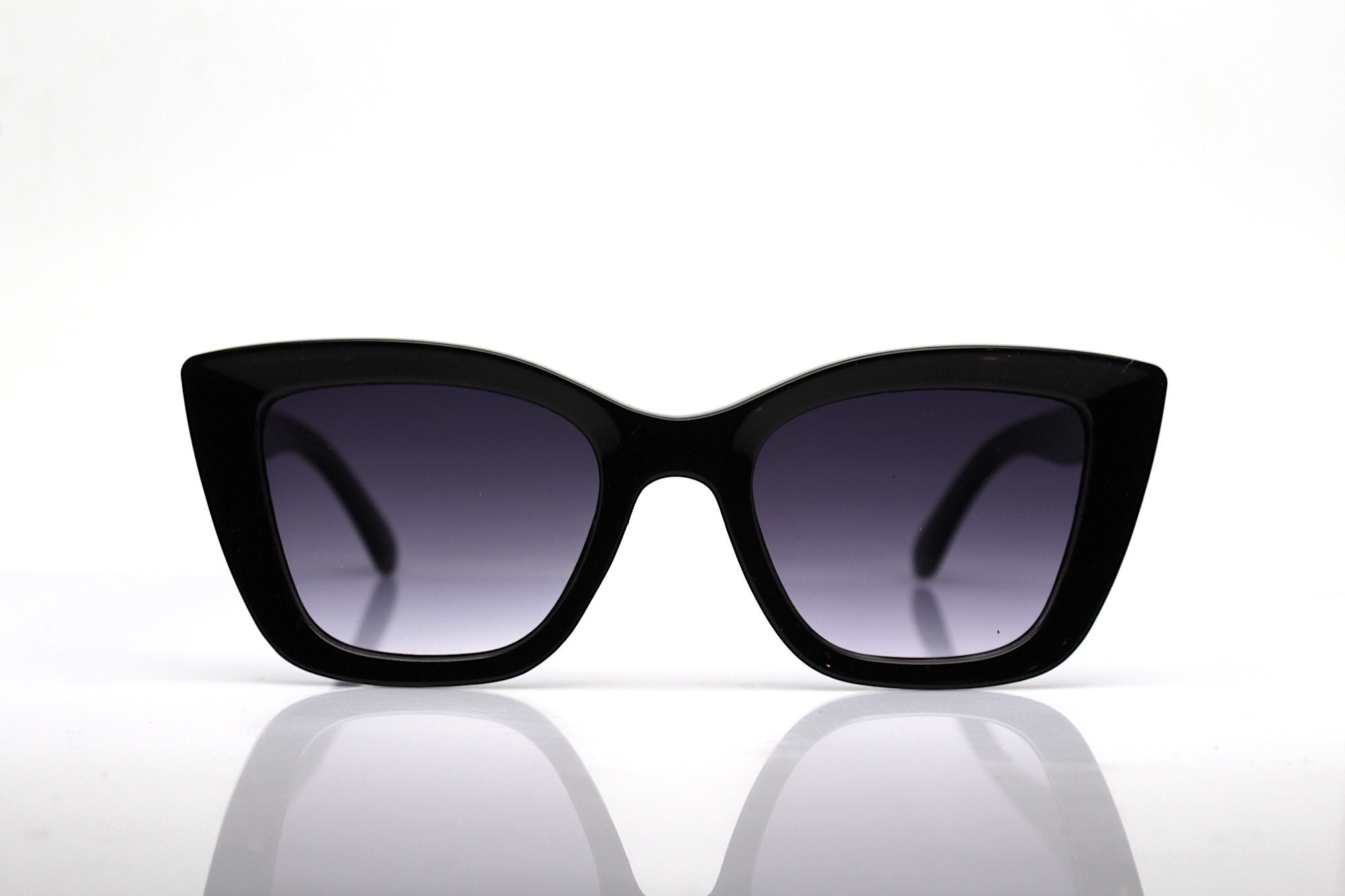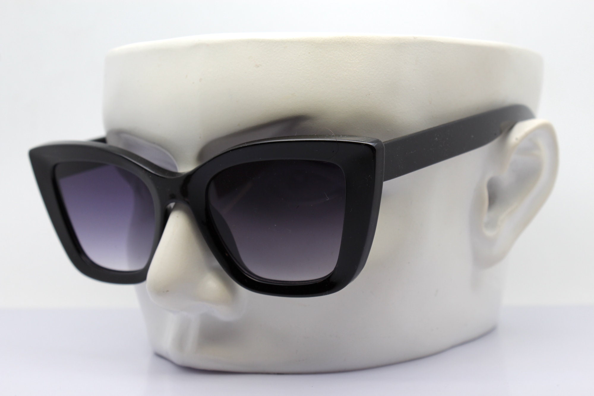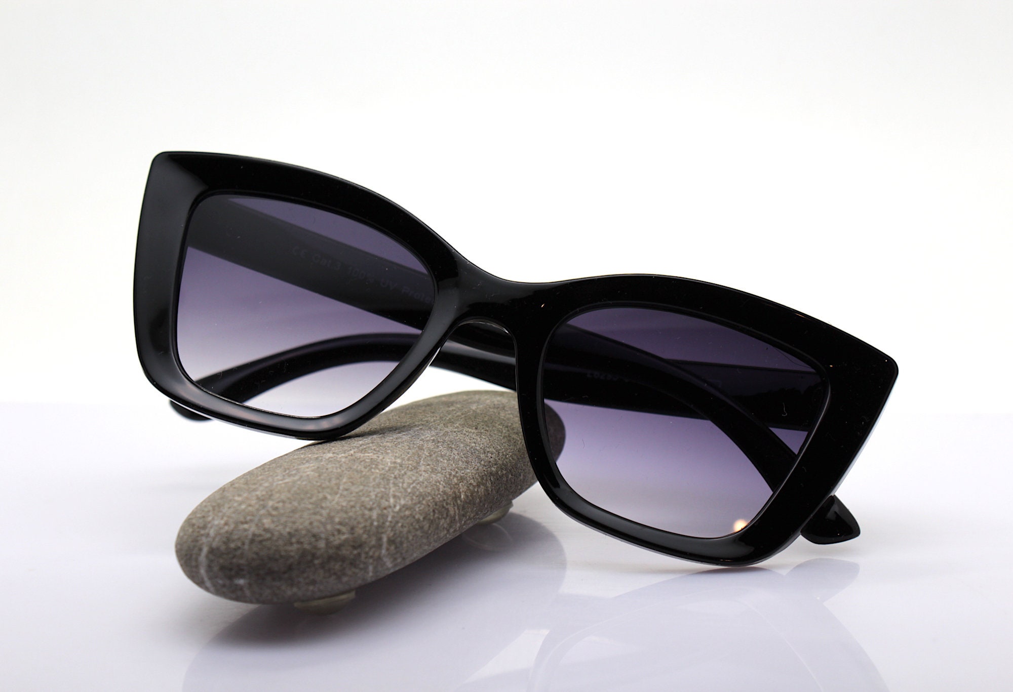 Cat eye's square classic sunglasses woman glossy black frame gradient shaded black lens vintage boho hippy retro style 50s 60s, glasses