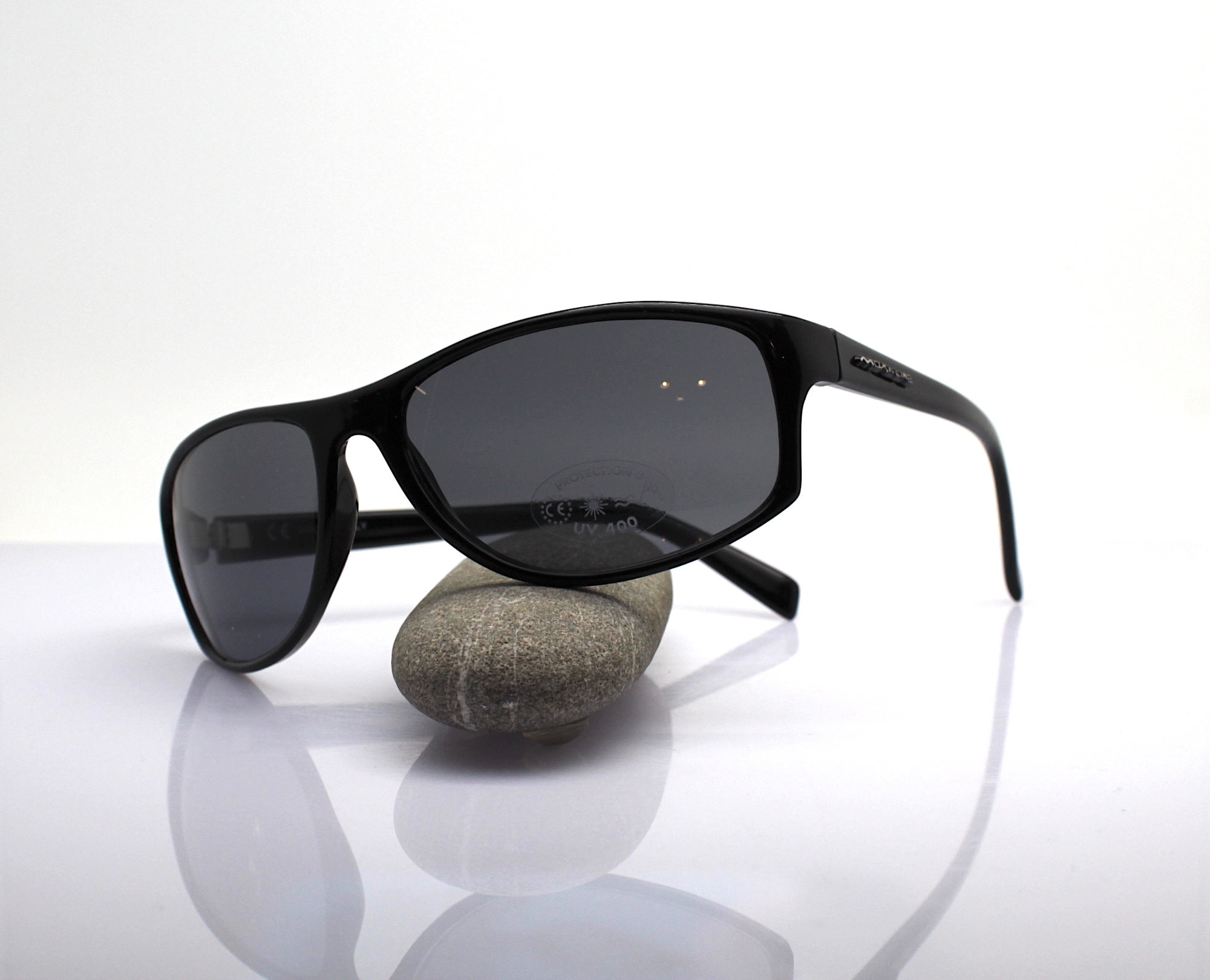 VINTAGE SUNGLASSES MAN, wrap curved rectangular oval faceted sporty style, glossy black frame smoke/black lens, italian made sunglasses 90s